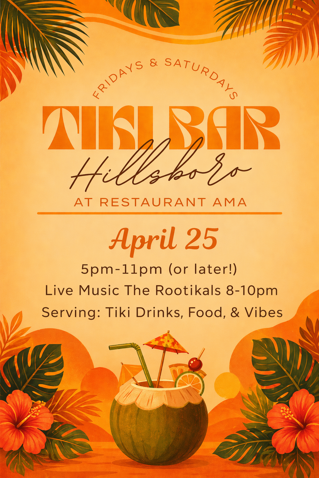 The Rootikals [Full Band] at the Tiki Bar above Restaurant AMA Saturday, April 25, 2026 8:00 PM 10:00 PM Google Calendar ICS Come check out Hilllsboros’ very own little speak easy, the Tiki Bar. Located above restaurant AMA, we bringing those reggae vibes. We had a blast last time so it’s only right we do it again! Lets